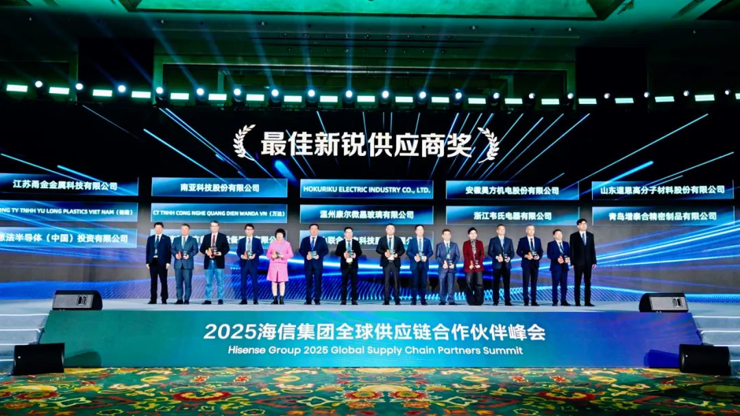 10月16日,在青岛举行的2025海信集团全球供应链合作伙伴峰会上,道恩股份荣获“最佳新锐供应商奖”,该公司常务副总经理王泽方上台领奖并参加技术开发项目签约仪式,研发总监王红围绕绿色低碳材料作专题演讲,展示了专家型企业形象,提升了道恩品牌知名度、美誉度和影响力。