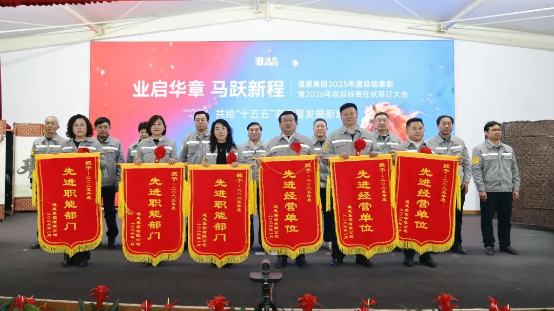 在下午召开的表彰大会上,道恩集团对2025年度作出突出贡献的先进集体、先进个人进行表彰。与会领导为获奖者颁发荣誉锦旗、荣誉证书及奖金。先进集体代表、先进个人代表先后登台发言,传递奋进力量,表达了新一年度立足岗位、再创佳绩的坚定决心。